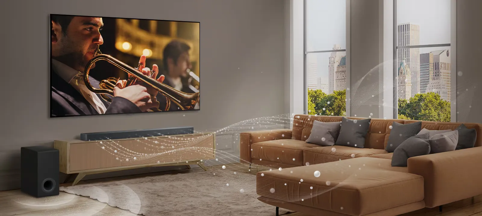 Elevate your TV to 7.1.4 channel to enjoy a real immersive experience, with 7 main sound channels, 1 wireless subwoofer and 4 up-firing channels.